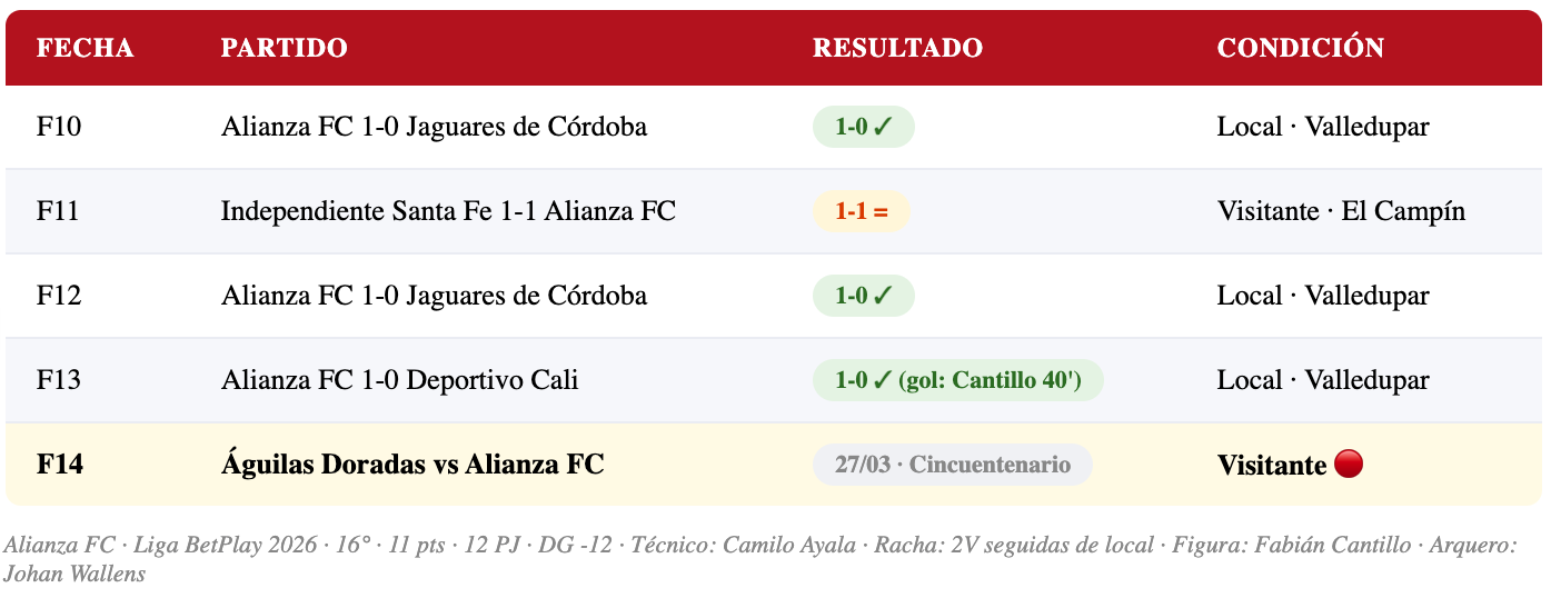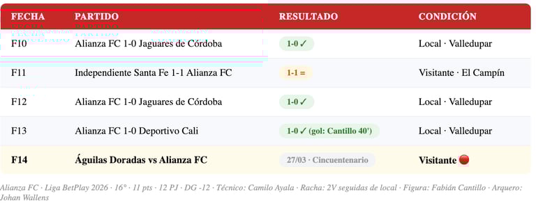 Alianza FC es el equipo que más ha crecido en la recta final del Todos contra Todos. Después de un torneo catastrófico en las primeras 10 fechas — apenas 1 victoria, 6 goles a favor y 19 en contra — el equipo del técnico Camilo Ayala encontró una versión completamente diferente. La victoria 1-0 sobre Jaguares (F12), el empate 1-1 ante Santa Fe (F11) y la victoria 1-0 sobre Deportivo Cali en Valledupar (F13) son tres resultados que cambian el panorama. Fabián Cantillo fue el héroe ante Cali con un gol de cabeza al minuto 40, y el equipo mostró una solidez defensiva que no había tenido en todo el torneo.