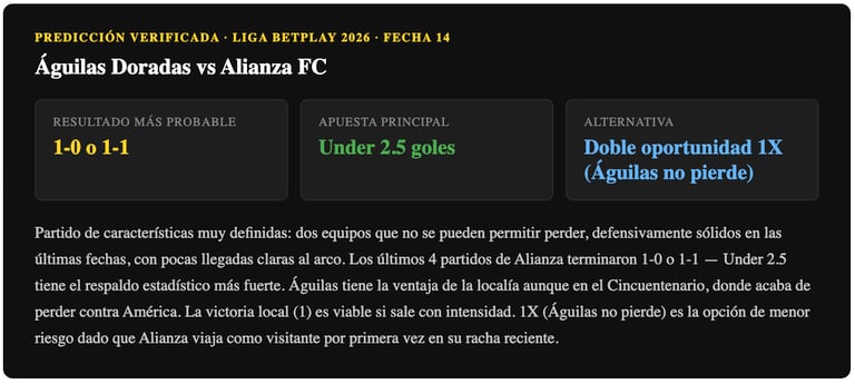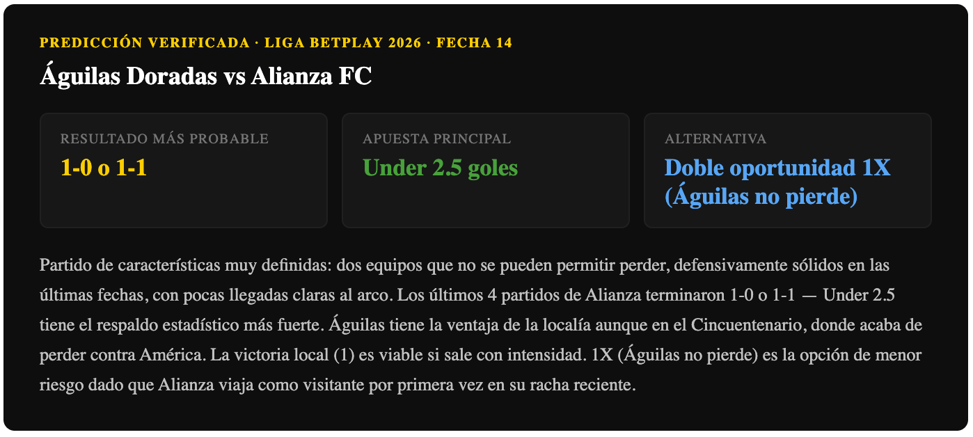 Dos equipos que necesitan puntos con urgencia, con contextos muy distintos: Águilas como local buscando revancha tras la derrota ante América, Alianza como visitante con la mejor racha del torneo. El empate es el resultado más lógico estadísticamente — ambos equipos han mostrado solidez defensiva reciente y ninguno se puede permitir perder. Under 2.5 tiene respaldo sólido: los últimos cuatro partidos de Alianza terminaron con 1 gol total. La victoria local es posible si Águilas impone el ritmo desde el inicio.