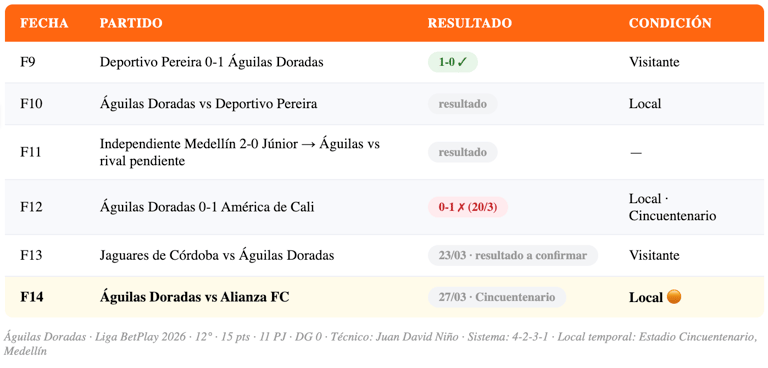 Águilas Doradas recibe a Alianza FC el viernes 27 de marzo en el Estadio Cincuentenario de Medellín. Alianza llega en racha con 2 victorias seguidas ante Jaguares y Deportivo Cali, pero ahora viaja como visitante. Duelo directo de la zona baja. Predicción verificada.