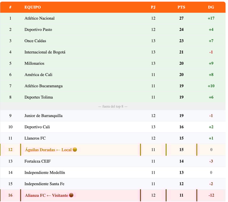 Con Nacional (27 pts), Pasto (24 pts), Once Caldas (23 pts) e Internacional (21 pts) dominando la parte alta, la lucha real de este partido es la de abajo: Águilas necesita seguir por encima del puesto 8 y Alianza necesita salir de zona de angustia antes de que se cierre el torneo. Hay solo 15 puntos en juego hasta el final del Todos contra Todos.