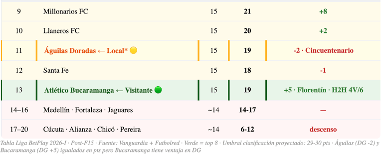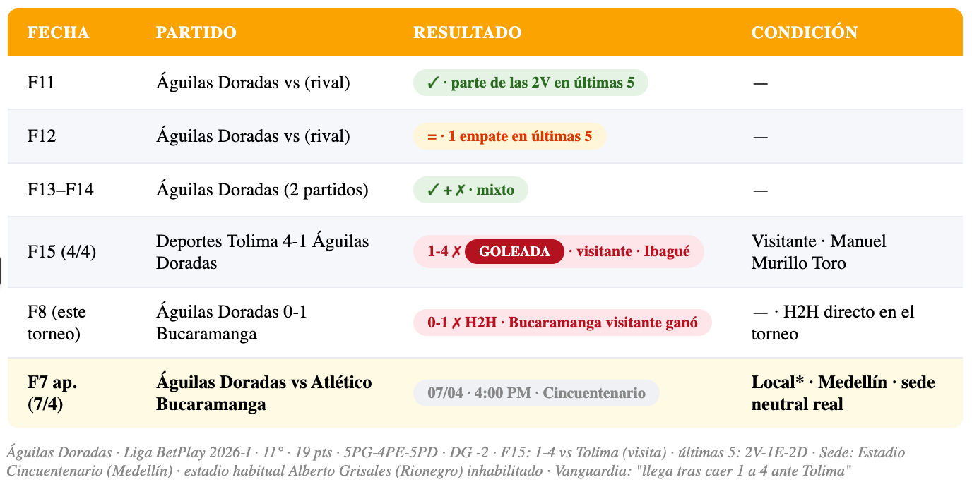 Águilas Doradas de Rionegro llega al partido golpeado por la derrota 1-4 ante Deportes Tolima en la Fecha 15. El equipo antioqueño tiene una situación logística complicada — su estadio habitual, el Alberto Grisales de Rionegro, está inhabilitado por conflictos con la Alcaldía de ese municipio, por lo que juega sus partidos de "local" en el Cincuentenario de Medellín. Esta condición de estadio neutral quita parte del factor local real. Con 19 puntos en el 11° lugar, Águilas necesita ganar para no perder pisada en la pelea por el top 8.