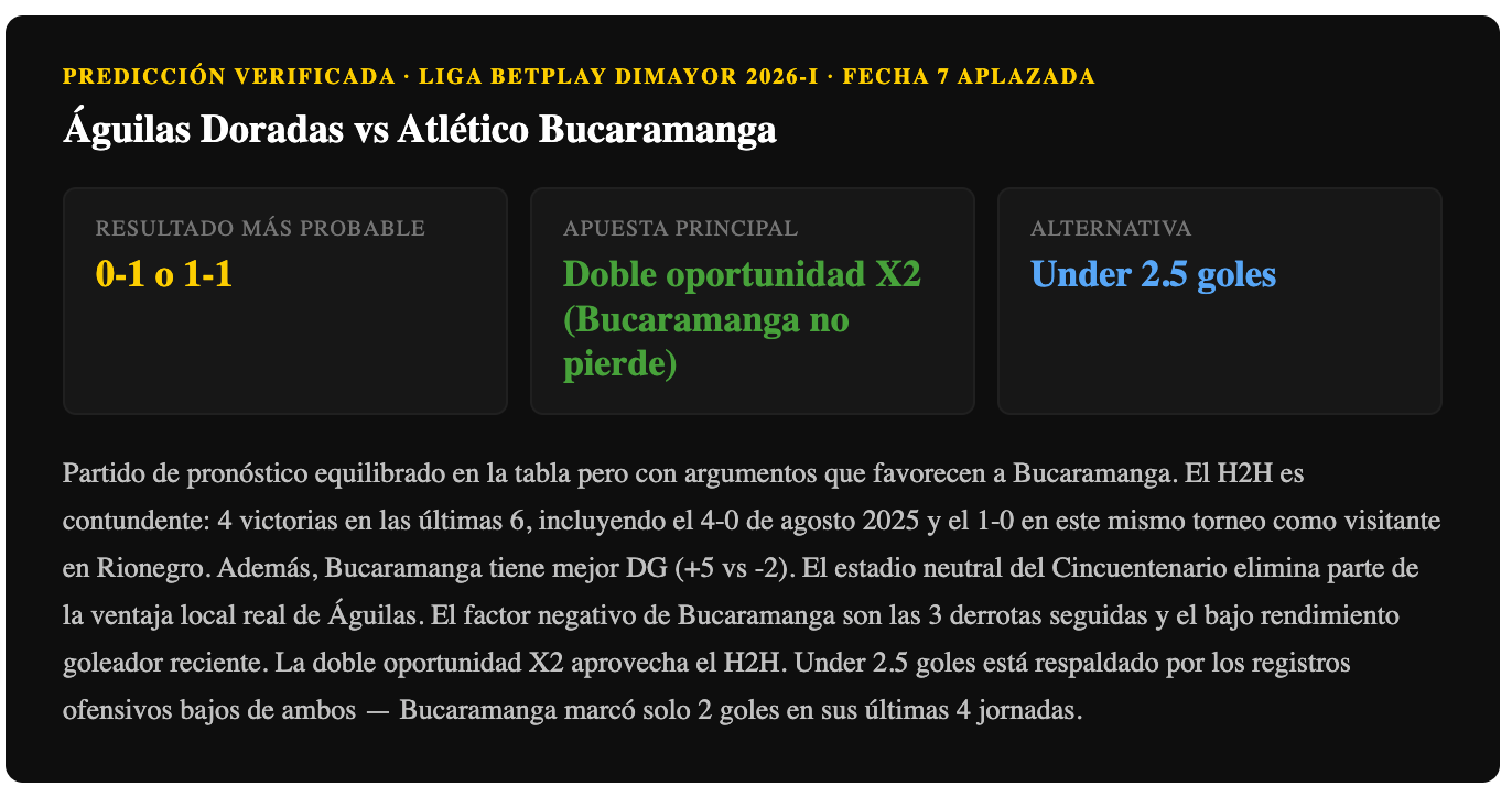 Pronóstico Águilas Doradas vs Atlético Bucaramanga — Liga BetPlay 2026