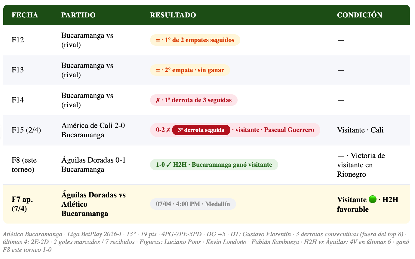 Atlético Bucaramanga de Gustavo Florentín llega al partido en su momento más delicado del semestre. Tres derrotas consecutivas — incluyendo el 0-2 ante América de Cali en F15 — lo sacaron del grupo de los ocho. En sus últimas 4 jornadas: 2 empates y 2 derrotas, con solo 2 goles marcados y 7 recibidos. Sin embargo, el H2H habla fuerte a su favor: 4 victorias en los últimos 6 enfrentamientos con Águilas, incluyendo el golpazo reciente de 4-0 en agosto de 2025. El "Leopardo" tiene calidad en plantilla — Luciano Pons, Kevin Londoño, Fabián Sambueza — pero necesita reencontrar el funcionamiento.