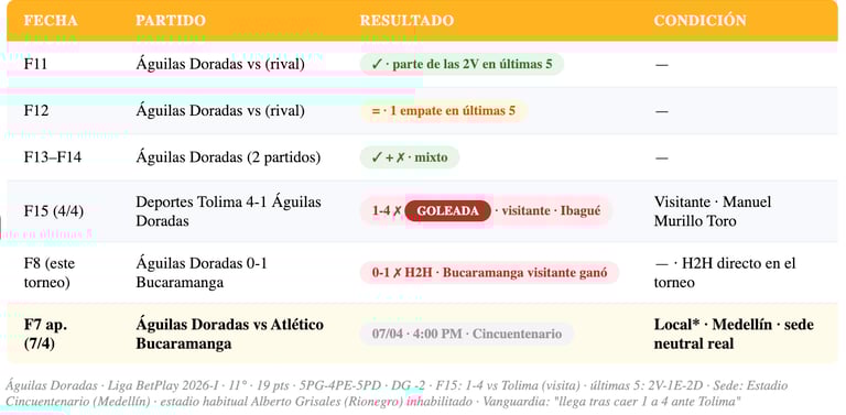 💡 H2H en F8 de este torneo: Bucaramanga 1-0 Águilas (Bucaramanga visitante, Rionegro)