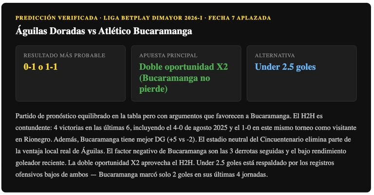 Partido muy parejo en la tabla (19-19) pero el H2H y la mejor DG de Bucaramanga (+5 vs -2) dan argumentos al visitante. El DG del "Leopardo" es significativamente mejor. El estadio neutral del Cincuentenario anula parte de la ventaja local de Águilas. La doble oportunidad X2 (Bucaramanga no pierde) y under 2.5 goles tienen el mayor respaldo dado el momento de ambos — equipos que no están marcando muchos goles últimamente.
