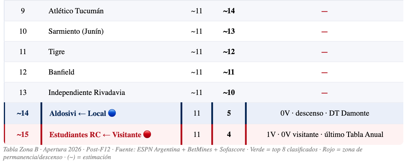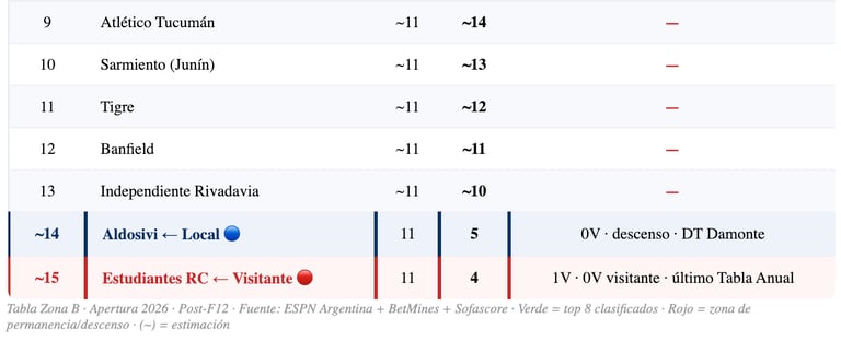 En el fútbol argentino, el descenso se define por la Tabla Anual — el promedio de puntos obtenidos en las últimas tres temporadas completas. No alcanza con salvar solo este torneo; el acumulado histórico define quién baja. Aldosivi está en penúltimo lugar de la Tabla Anual, y Estudiantes RC está en el último. Un partido entre los dos equipos más comprometidos con el descenso del torneo — el que pierda hoy profundiza aún más su situación de riesgo. Los tres puntos de este Minella valen más que en cualquier otra cancha de la Zona B.