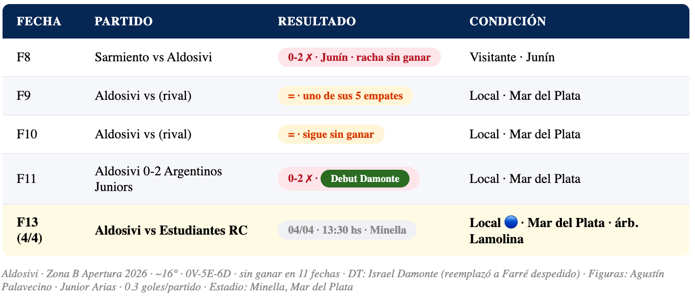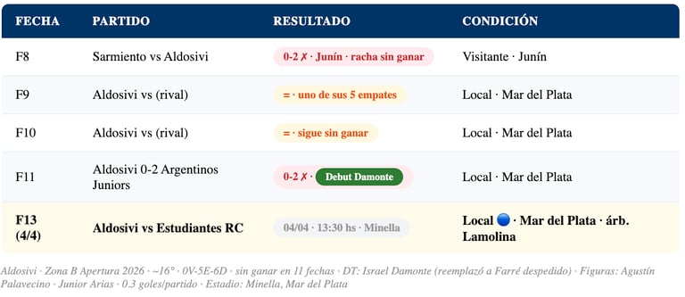 📊 Aldosivi — F13: ~16° Zona B · 0V-5E-6D · 0 victorias en 11 fechas · descenso comprometido