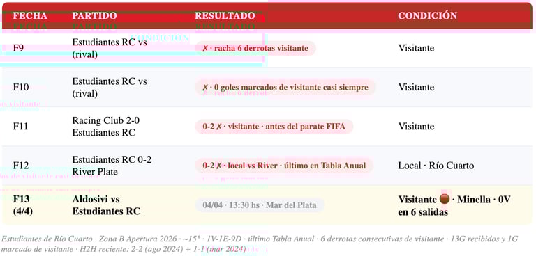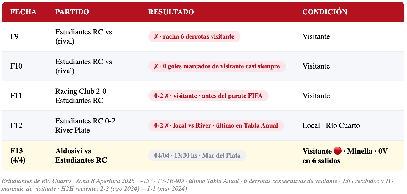 Estudiantes de Río Cuarto llega a Mar del Plata en condición de visitante — y eso, en el Apertura 2026, es casi una garantía de derrota. El equipo cordobés acumula 6 derrotas consecutivas de visitante en el torneo, concediendo 13 goles y marcando apenas 1. Su único triunfo del año fue de local. Los últimos partidos antes del parate de Fecha FIFA fueron derrota 2-0 ante Racing Club y derrota 0-2 ante River Plate en casa — rivales de mayor jerarquía, pero la tendencia es clara: este equipo no encuentra la forma de competir fuera de su estadio. La Tabla Anual lo ubica en el último lugar, por debajo de Aldosivi.