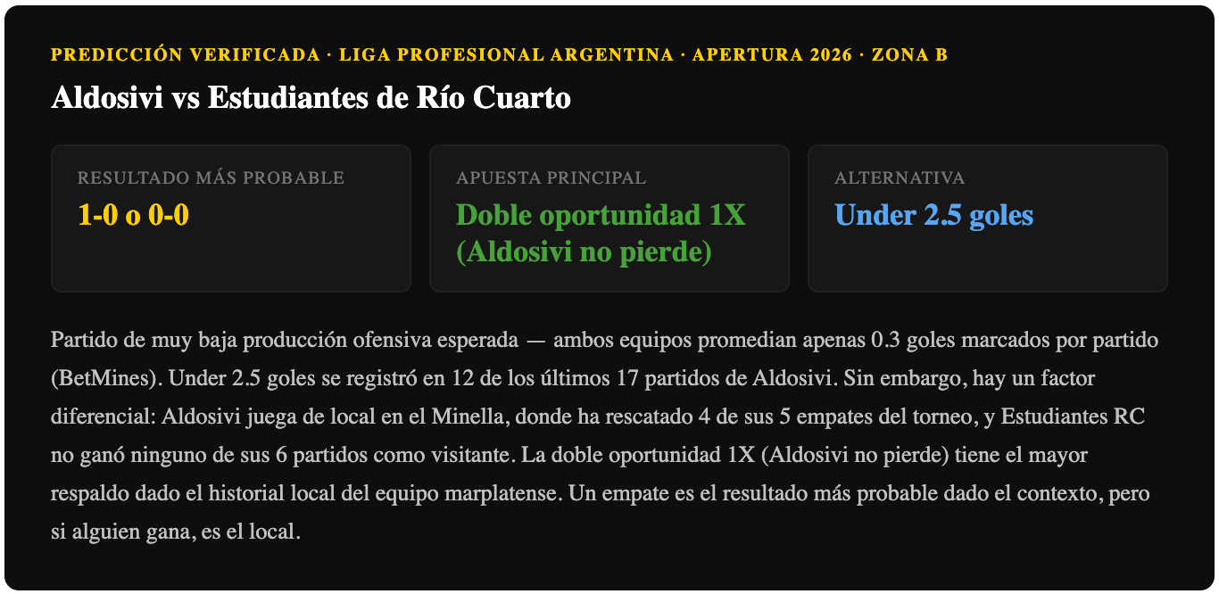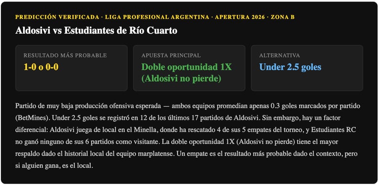 Partido de muy bajo puntaje esperado — ambos equipos promedian 0.3 goles por partido, BetMines señala que Under 2.5 goles se registró en 12 de los últimos 17 partidos de Aldosivi. La localía de Aldosivi es el factor diferencial — en casa han rescatado 4 de sus 5 empates. Doble oportunidad 1X (Aldosivi no pierde) y Under 2.5 goles son las apuestas con mayor respaldo estadístico.