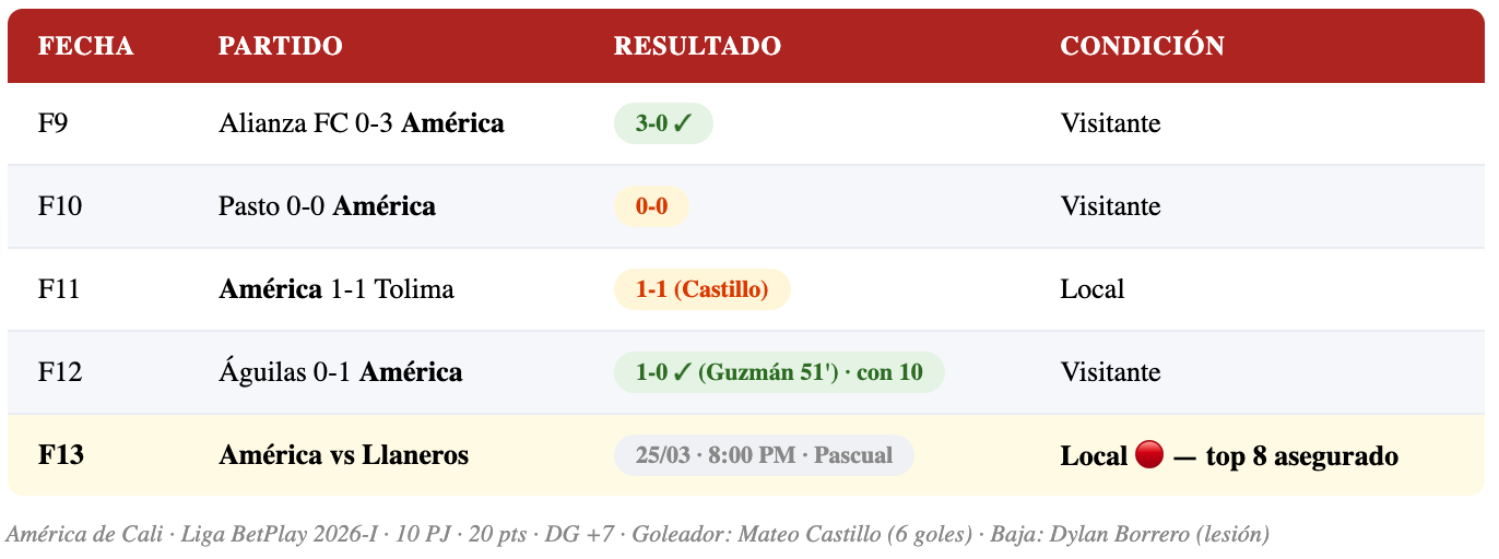 América viene de cerrar la Fecha 12 con una victoria eficiente —aunque no brillante— ante Águilas Doradas en Medellín. El gol de Yeison Guzmán al minuto 51, de zurda tras un centro perfecto de Carrascal, fue suficiente para los tres puntos a pesar de terminar con 10 hombres por la roja a Marlon Torres al 56'. El equipo de David González demostró que sabe sufrir cuando la situación lo exige. La victoria ante Tolima (1-1 en Fecha 11) y ante Alianza (3-0 en Fecha 9) conforman una racha sólida.