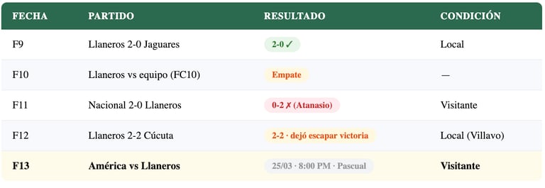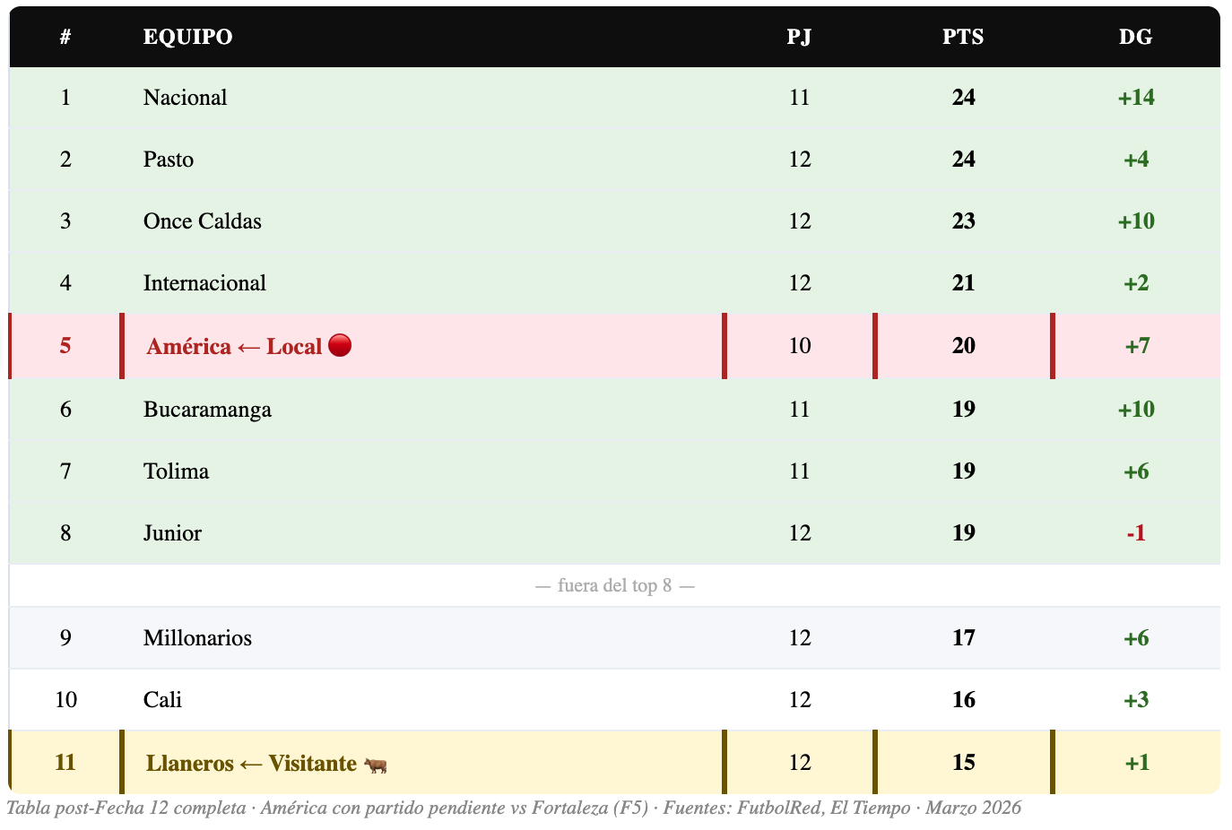 América está sólidamente en el top 8 pero quiere escalar más. Con 20 puntos en 10 partidos — promedio de 2 puntos por partido — tiene un rendimiento superior al de casi todos los equipos a su alrededor. Llaneros, con 15 en 12, tiene margen pero está fuera de zona de clasificación. Una victoria del "Diablo Rojo" hoy lo catapultaría provisionalmente a la 4° o 5° posición dependiendo de los demás resultados de la jornada.