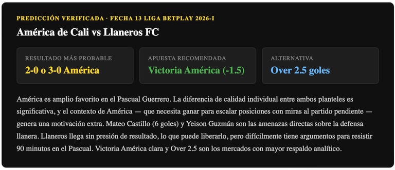 Pronóstico América de Cali vs Llaneros FC — Fecha 13 Liga BetPlay 2026