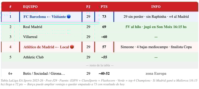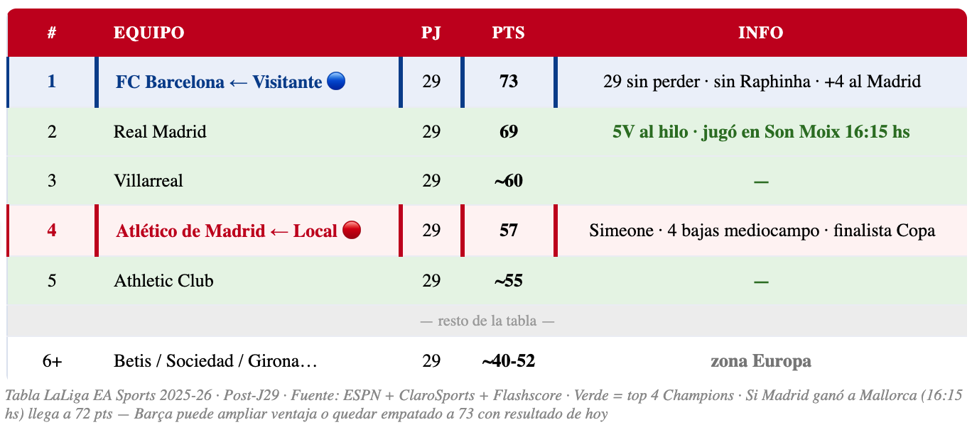 El Riyadh Air Metropolitano de Madrid recibe este sábado el partido de LaLiga más importante de la temporada — y el primero de un triplete épico entre los dos equipos en 10 días. Barcelona de Hansi Flick llega como líder (73 pts, 29 partidos sin perder en Liga) pero sin Raphinha por lesión. Atlético de Madrid de Diego Simeone recibe con el plus moral de haber eliminado al Barça en Copa del Rey (4-3 global) pero con bajas brutales en el mediocampo. El Metropolitano, donde solo el Betis ganó esta temporada, será el escenario del primer termómetro antes de los cuartos de Champions.