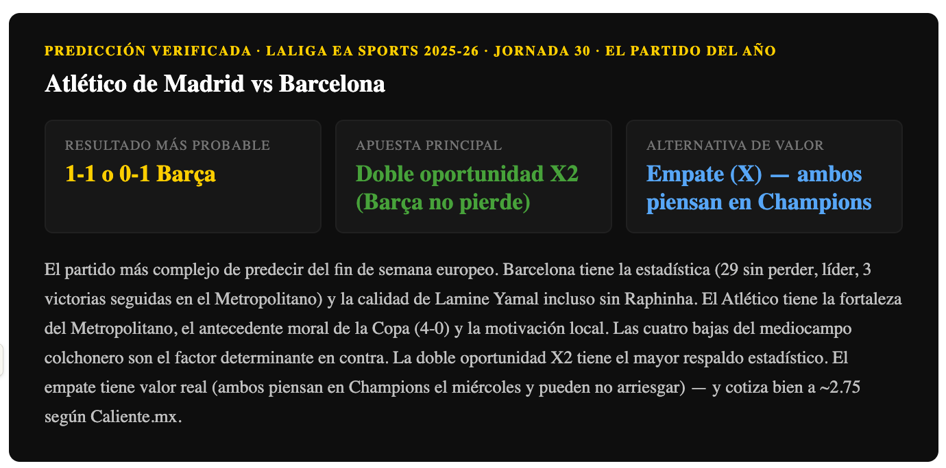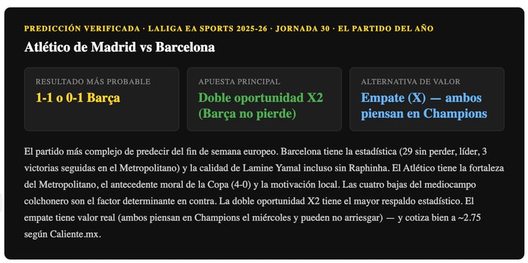 Pronóstico Atlético de Madrid vs Barcelona — Jornada 30 LaLiga 2026