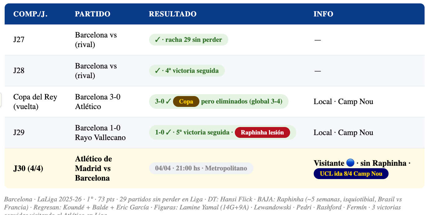 📊 Barcelona — J30: 1° · 73 pts · 29 partidos sin perder en Liga · a 4 del Real Madrid