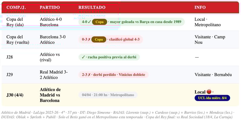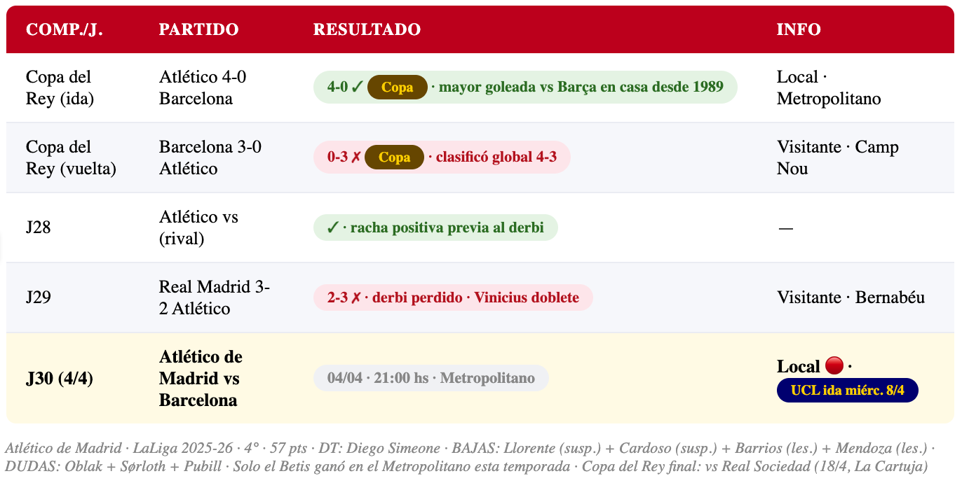 🏆 ANTECEDENTE COPA: Atlético eliminó al Barcelona en las semifinales de la Copa del Rey — victoria 4-0 en el Metropolitano (ida) y derrota 0-3 en el Camp Nou (vuelta), clasificándose con un global de 4-3. Flashscore: "la mayor goleada rojiblanca ante este rival en casa desde 1989." La moral del Atleti ante el Barça este año es especial.
