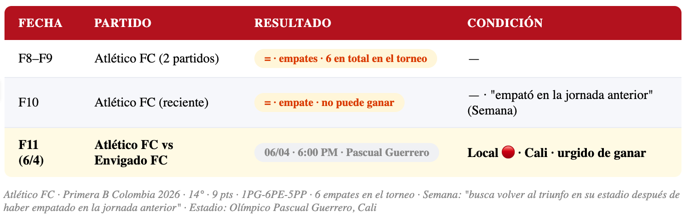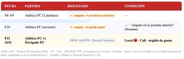 Atlético FC llega al partido en una posición comprometida — 14° lugar con 9 puntos en un registro de 1 victoria, 6 empates y 5 derrotas. El equipo ha mostrado una tendencia a empatar (6 en el torneo), lo que habla de un equipo que compite pero no logra concretar las victorias necesarias para escalar. Jugar en el Pascual Guerrero como local ante un Envigado que viene bien puede ser un reto enorme, pero la necesidad los obliga a salir a buscar los 3 puntos.
