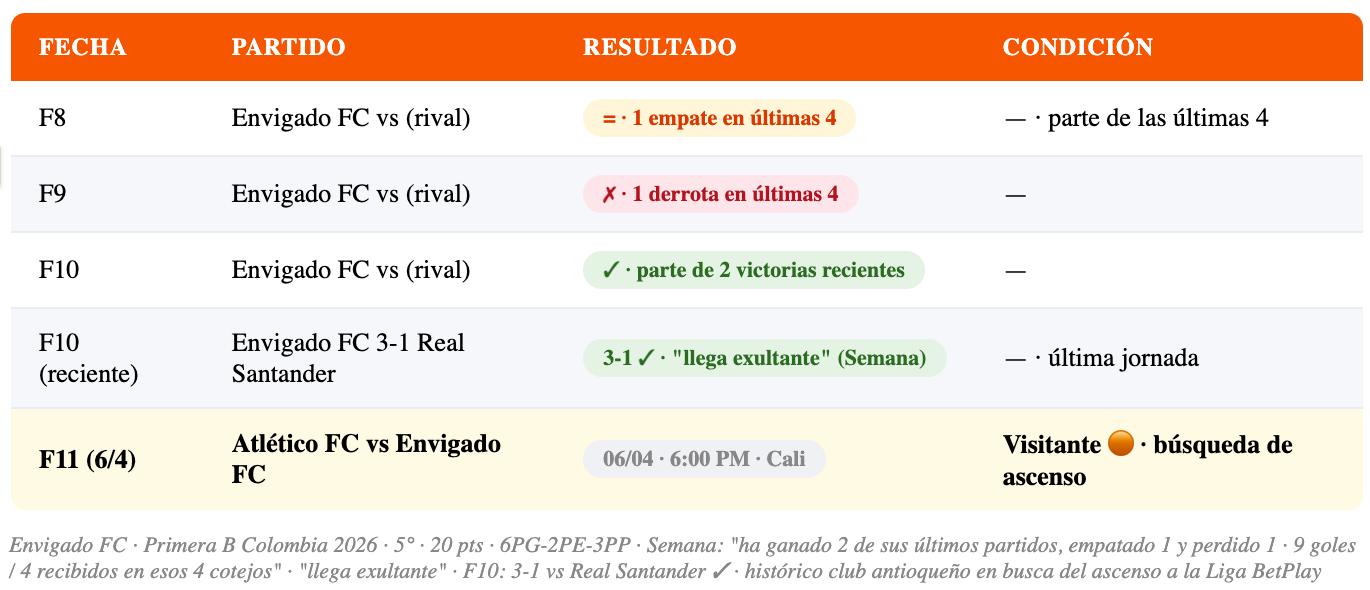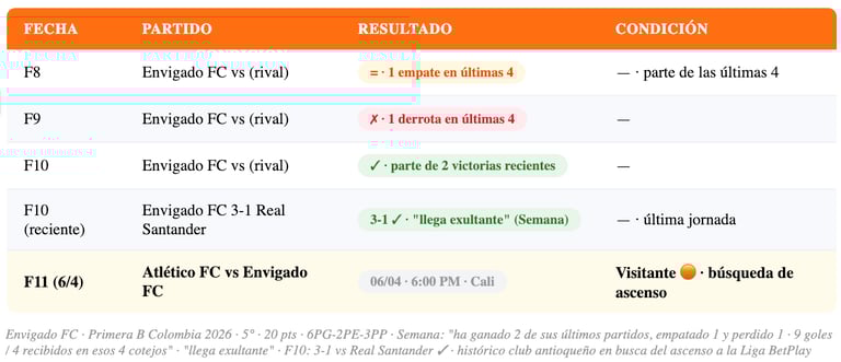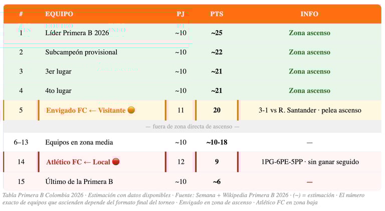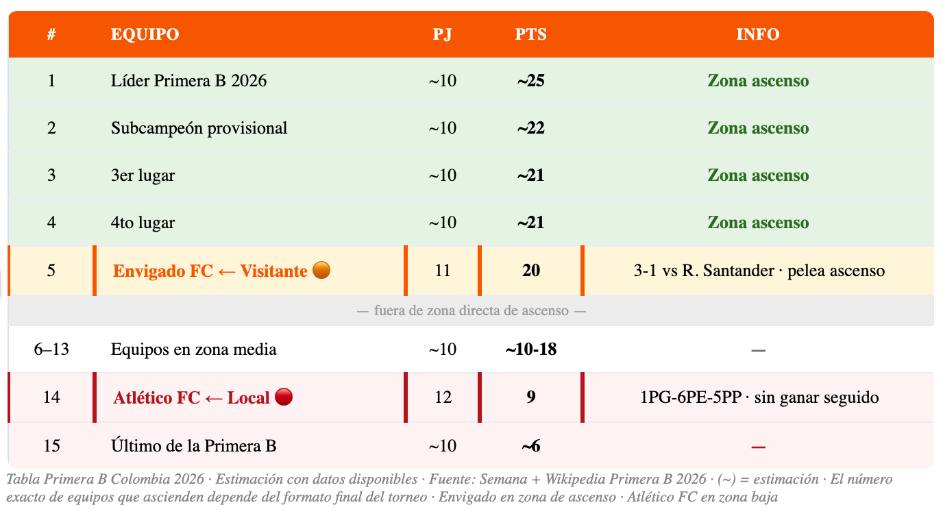 📊 CONTEXTO ASCENSO: En la Primera B de Colombia, los primeros equipos de la tabla al finalizar la fase todos contra todos clasifican a una fase final donde se define el o los ascendidos a la Liga BetPlay. Con 20 puntos, Envigado está bien posicionado pero no ha asegurado nada todavía.