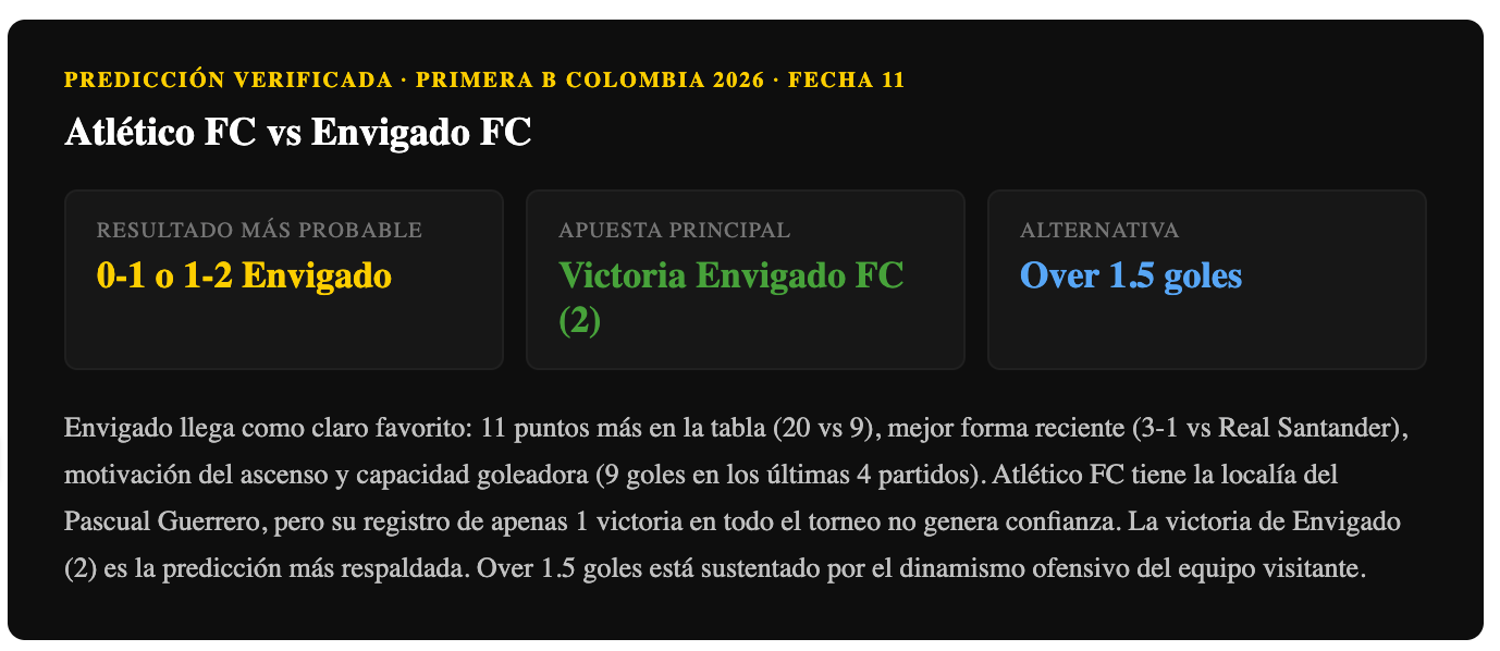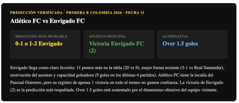 Pronóstico Atlético FC vs Envigado FC — Fecha 11 Primera B Colombia 2026