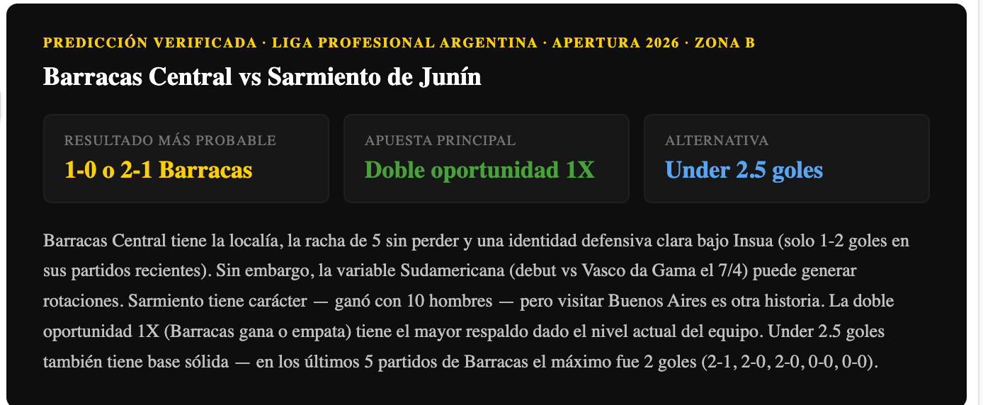 Barracas Central llega en racha de 5 partidos sin perder (7° Zona B, 16 pts) y con debut en Copa Sudamericana vs Vasco da Gama en 5 días. Sarmiento ganó 2-0 con 10 hombres. Jueves 2 de abril, 15 hs Argentina / 13:00 PM Colombia. Predicción verificada.