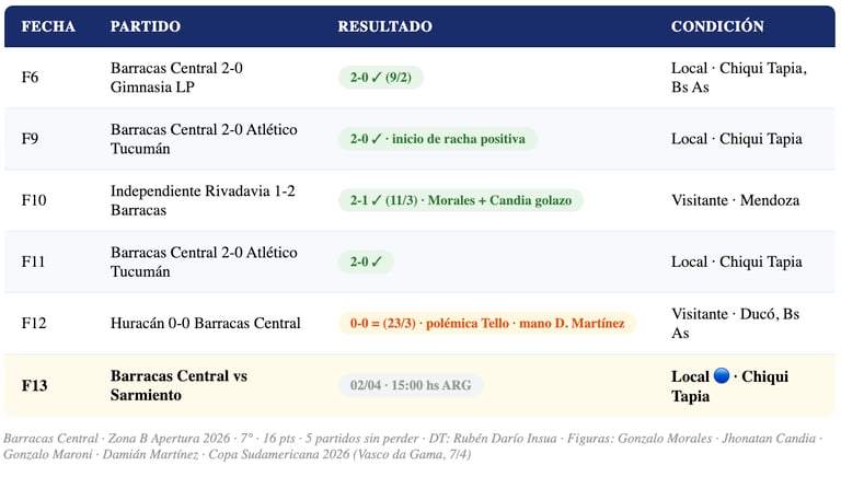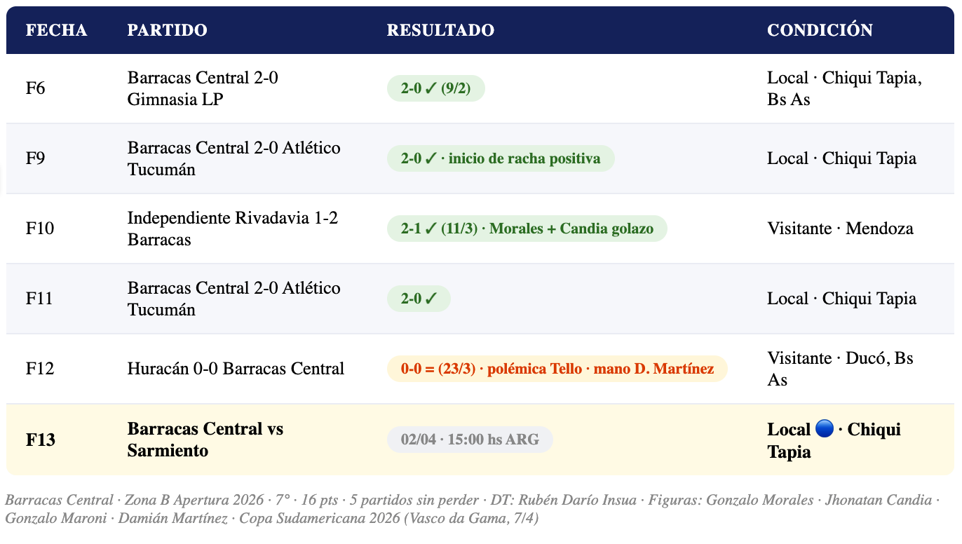 🔥 5 PARTIDOS SIN DERROTAS: Barracas Central llega a este partido con una racha de cinco encuentros consecutivos sin perder en el Apertura 2026 (AgenciaNova, post-F12). Victorias ante Independiente Rivadavia (2-1 visitante) y Atlético Tucumán (2-0), más empates ante Deportivo Riestra, Argentinos Juniors y Huracán. El DT Rubén Darío Insua ha encontrado un equipo sólido y equilibrado.