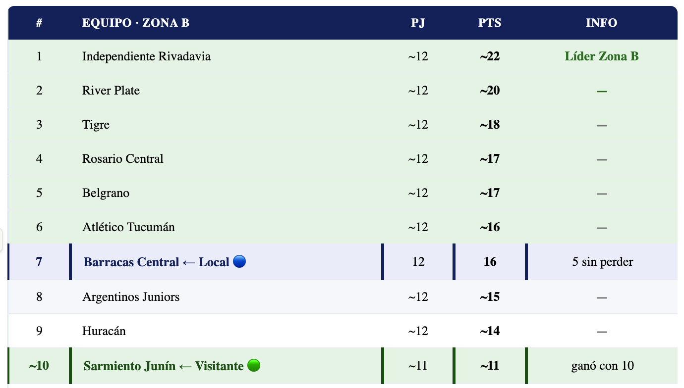 El Torneo Apertura 2026 de la Liga Profesional Argentina se juega con el formato de grupos — Zona A y Zona B — donde los mejores equipos de cada grupo avanzan a los octavos de final. La Zona B tiene a Independiente Rivadavia como líder, con River Plate y otros equipos peleando los primeros puestos. Barracas (7°, 16 pts) y Sarmiento (~10°, ~11 pts) están en la zona media-baja de la tabla, donde cada punto es crucial para no quedar afuera de los octavos en las últimas 5 fechas del torneo.