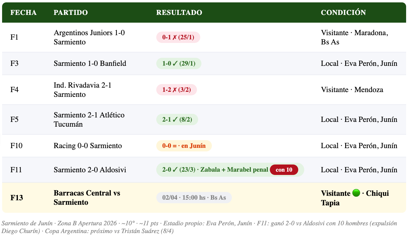 ⚽ F10: Racing 0-0 Sarmiento = (en Junín) · F11 (23/3): Sarmiento 2-0 Aldosivi ✓ (Zabala + Marabel penal) — con 10 hombres