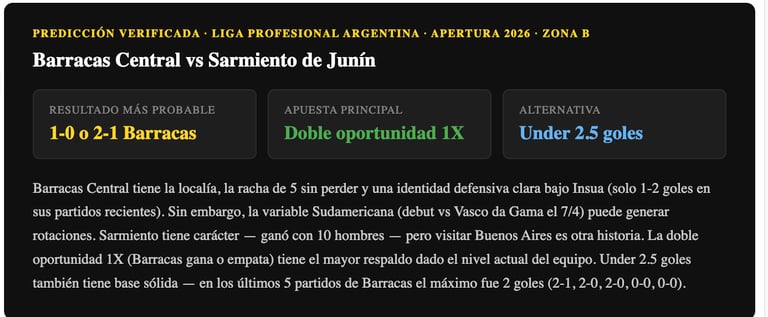 El debut de Barracas Central en la Copa Sudamericana ante Vasco da Gama (7 de abril) es una variable táctica clave. El DT Insua deberá decidir si sale con el equipo de gala ante Sarmiento o si rota para cuidar jugadores pensando en el debut internacional. Si Barracas dosifica el esfuerzo, Sarmiento puede aprovecharlo. Si Barracas va con todo, la racha de 5 sin perder sugiere que el local tiene herramientas para ganar.