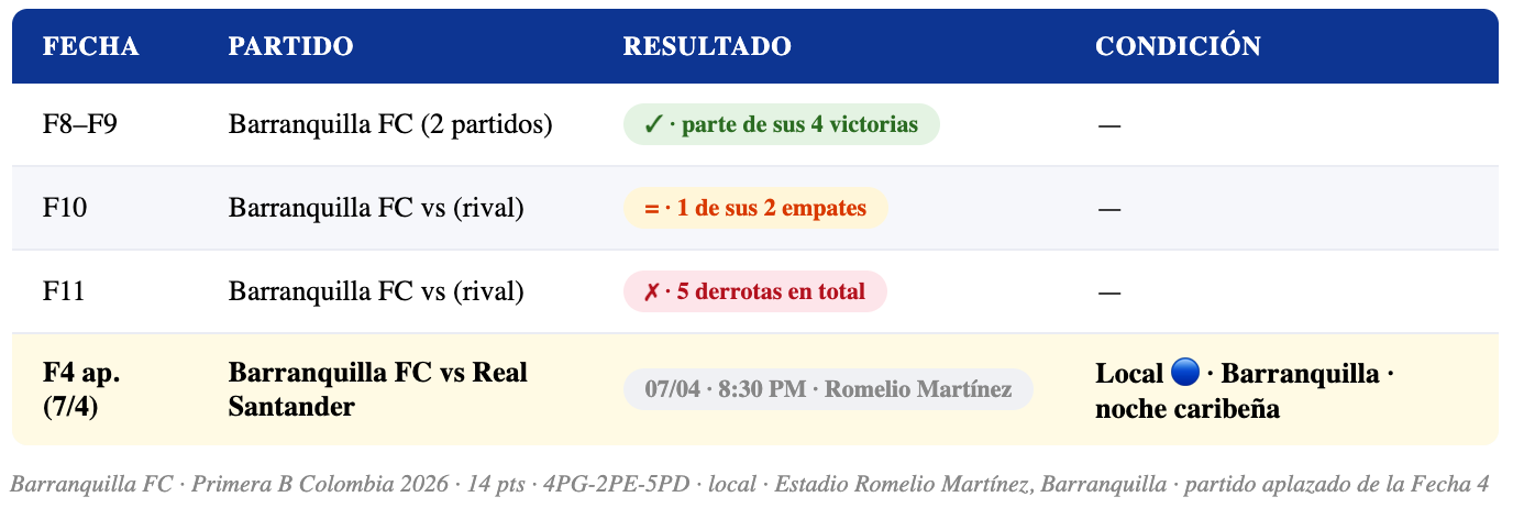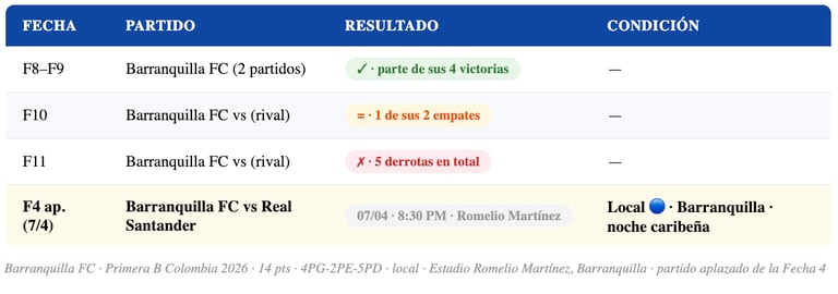 📊 Barranquilla FC — F4 ap.: ~8° · 14 pts · 4PG-2PE-5PD · local