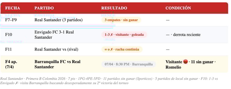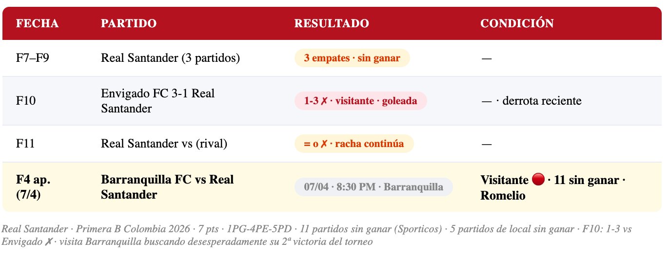 📊 SITUACIONES OPUESTAS: Barranquilla FC (14 pts) lleva 7 puntos más que Real Santander (7 pts). Los visitantes atraviesan su peor racha del torneo: 11 partidos seguidos sin ganar (Sporticos). Con ese contexto, el partido pinta como una oportunidad clara para el local.