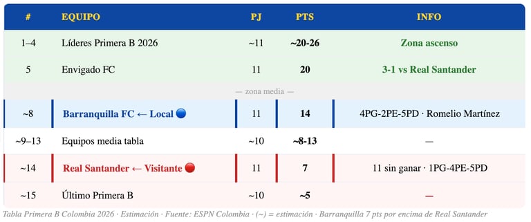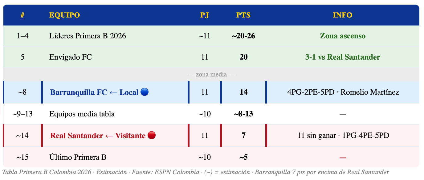 El Estadio Romelio Martínez de Barranquilla recibe este martes un partido de la Primera B de Colombia aplazado desde la Fecha 4. Barranquilla FC (14 pts, 4PG-2PE-5PD) recibe al fondo de la tabla Real Santander (7 pts, 1PG-4PE-5PD), un equipo que llega a este partido sin haber ganado en los últimos 11 partidos consecutivos. El local tiene la ventaja del estadio caribeño — conocido como "La Caldera del Caribe" — y la necesidad de seguir sumando en la pelea por los puestos de ascenso.