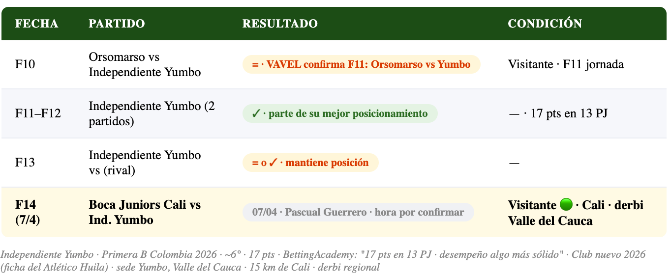 📊 Independiente Yumbo — F14: ~6° · 17 pts · visitante