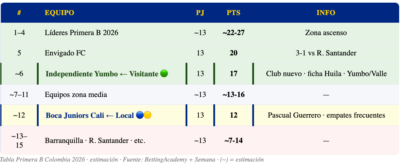 El Estadio Olímpico Pascual Guerrero de Cali recibe este martes un duelo de zona media en la Primera B de Colombia. Boca Juniors de Cali (12 pts en 13 PJ) es el anfitrión ante el Independiente Yumbo (17 pts en 13 PJ) — el nuevo club del Valle del Cauca que nació de la ficha del histórico Atlético Huila. Con 5 puntos de diferencia en la tabla, Yumbo llega como visitante con la mejor posición pero en un estadio caleño que puede ser un factor.