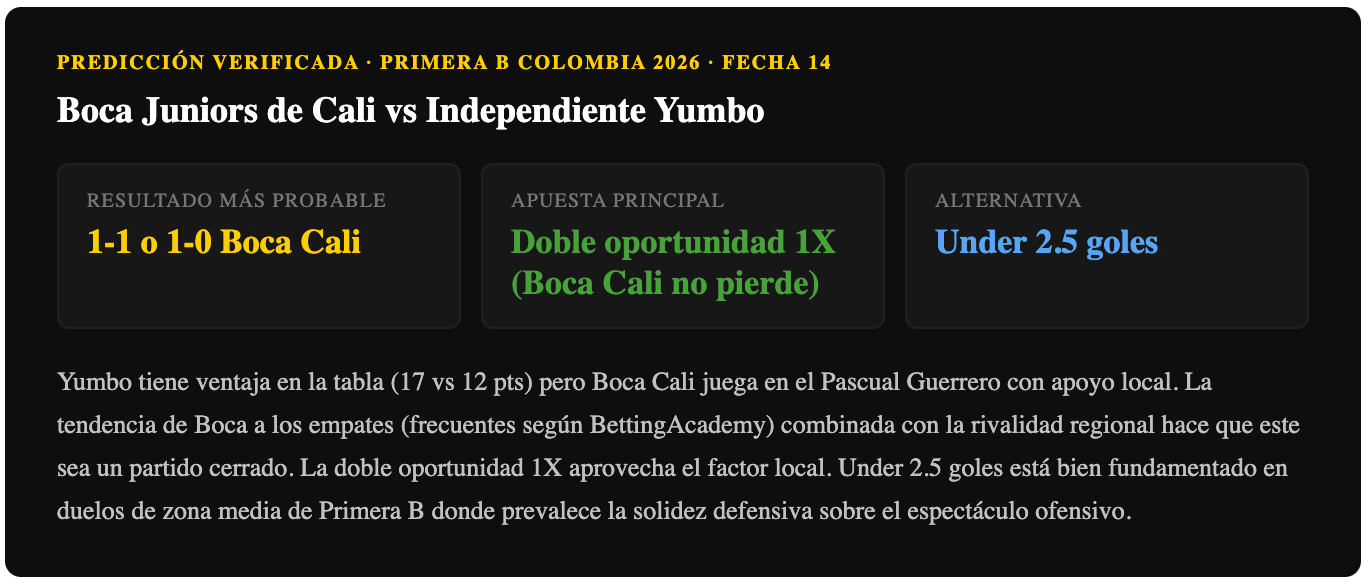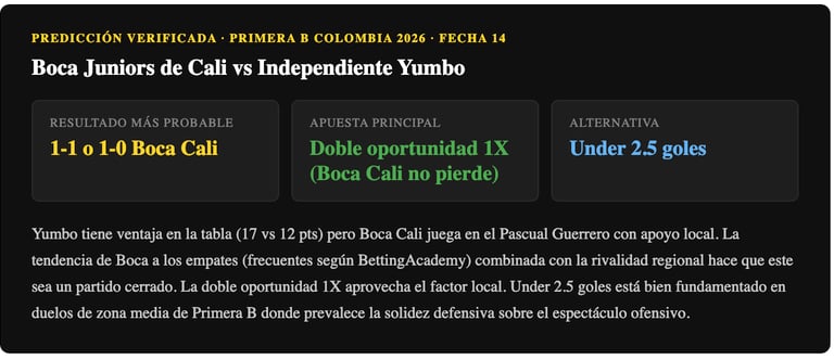 Yumbo tiene la ventaja estadística (17 vs 12 pts) pero Boca Cali juega en el Pascual Guerrero — el mismo estadio donde juega América de Cali — y los últimos 5 H2H entre estos equipos mostraron equilibrio. Empate o victoria local son los resultados más respaldados en este tipo de duelos de zona media de Primera B.
