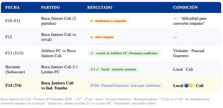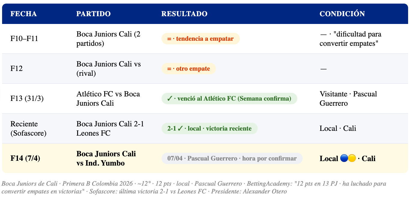 Boca Juniors de Cali llega al partido con una temporada que refleja su principal problema: "ha tenido dificultades para convertir empates en victorias" (BettingAcademy). Con 12 puntos en 13 partidos, el equipo caleño muestra organización pero falta de contundencia ofensiva. Jugar en el Pascual Guerrero como local es su mayor ventaja en este duelo. El presidente del club es Alexander Otero y el estadio es el mítico recinto del fútbol caleño.