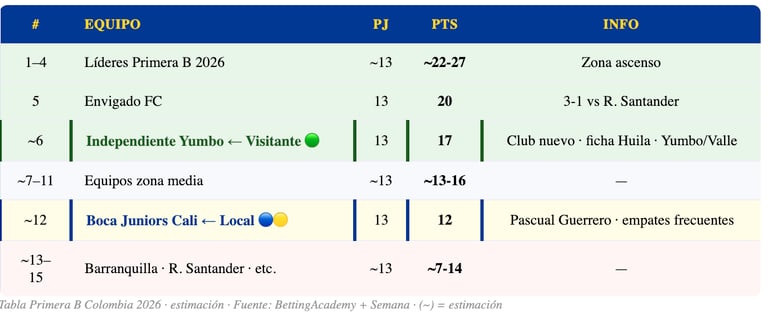 📊 ZONA MEDIA APRETADA: Con 17 puntos en 13 partidos, Yumbo está mejor posicionado que Boca Cali (12 pts), pero ninguno está ni en zona de ascenso ni en zona de descenso. Son 5 puntos de diferencia — los suficientes para que el partido sea importante para ambos.