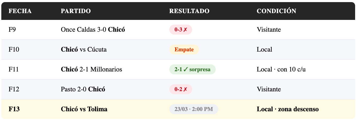 Sin embargo, hay destellos que generan algo de esperanza. En la Fecha 11, Boyacá Chicó protagonizó una de las sorpresas de la jornada al vencer 2-1 a Millonarios en La Independencia — aunque el partido terminó con diez jugadores por lado tras sendas expulsiones. En la Fecha 12, cayeron 0-2 ante Deportivo Pasto, volviendo a los números negativos.