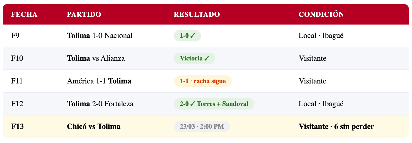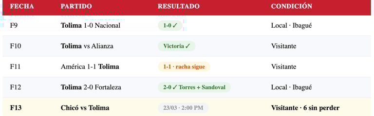 El rendimiento del equipo en las últimas jornadas ha sido sólido. En la Fecha 12, venció 2-0 a Fortaleza con goles de Juan Pablo Torres y Luis Sandoval. En la Fecha 11, empató 1-1 con América de Cali en un partido intenso. Y el mejor resultado de la racha fue el triunfo 1-0 sobre Atlético Nacional en la Fecha 9, que demostró que este Tolima es capaz de competir de igual a igual con los grandes.