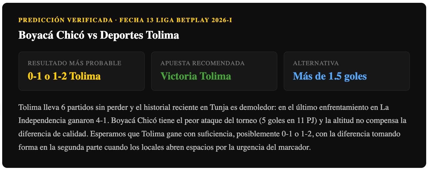 Pronóstico Boyacá Chicó vs Deportes Tolima — Fecha 13 Liga BetPlay 2026