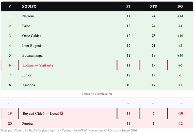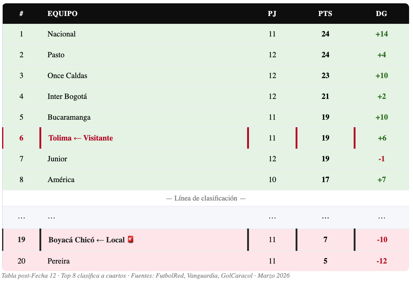 Tabla de posiciones — Liga BetPlay 2026-I antes de la Fecha 13