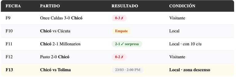 📊 Boyacá Chicó — Liga BetPlay 2026-I (11 PJ): 7 puntos · 19° lugar · zona descenso