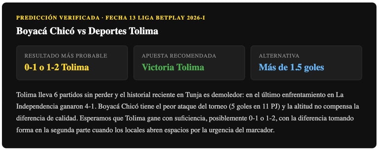 La fecha 13 de la Liga BetPlay 2026-I tiene un partido con poco equilibrio sobre el papel, pero el fútbol colombiano siempre guarda sorpresas. La altitud de Tunja, el ambiente de La Independencia y la urgencia de los locales por los tres puntos configuran un escenario donde Tolima no puede llegar confiado.