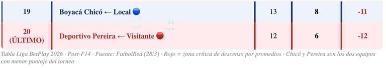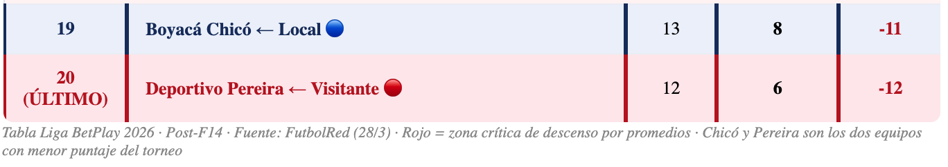 ⚠️ CHICÓ TAMBIÉN EN ZONA ROJA: Boyacá Chicó no está mucho mejor — 19° con 8 puntos, 2 victorias, 9 derrotas y 2 empates (BetMines). El "ajedrezado" ha concedido el primer gol en 10 de sus últimos 13 partidos y nunca ha podido remontar cuando va perdiendo. La tabla de descenso por promedios pesa sobre ambos equipos.