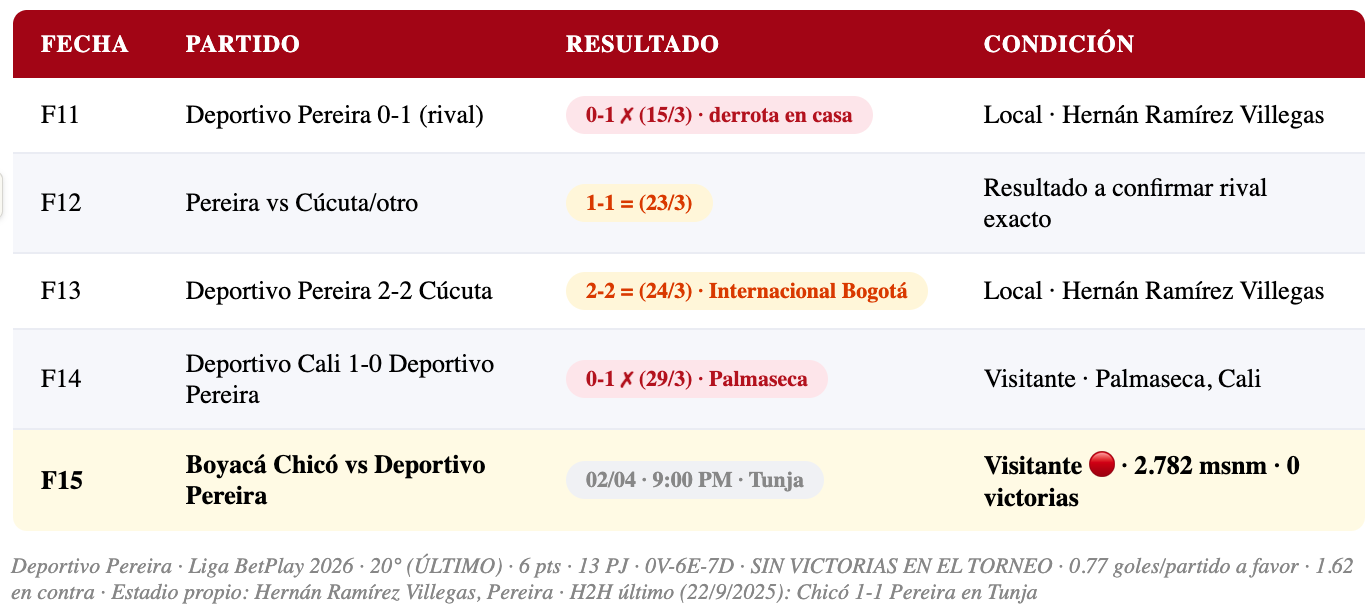 El último resultado fue la derrota 0-1 ante Deportivo Cali (29 de marzo) — confirmada por BetMines. Antes, un empate 1-1 con Chicó que no le alcanzó para nada. Visitar Tunja a 2.782 msnm sin haber ganado en 13 partidos es el escenario menos prometedor posible para el "matecaña".