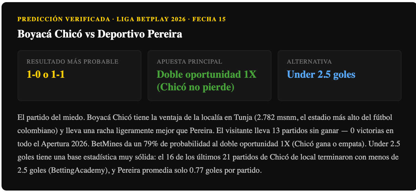 Pronóstico Boyacá Chicó vs Deportivo Pereira — Fecha 15 Liga BetPlay 2026