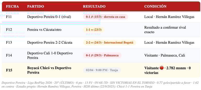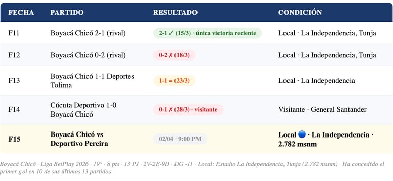 Boyacá Chicó tiene en La Independencia de Tunja su mejor escenario — el factor altitud (2.782 msnm, el estadio más alto del fútbol colombiano) siempre complica a los visitantes, especialmente a equipos de ciudad del eje cafetero como Pereira. El "ajedrezado" viene de una victoria importante 2-1 en la F11 pero ha sumado solo un punto en las tres fechas siguientes. La derrota 0-1 en Cúcuta (F14) fue la más reciente.