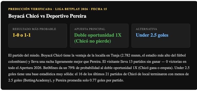 Chicó tiene la ventaja de la localía en Tunja (altitud extrema) y un registro ligeramente mejor que Pereira. Pereira lleva 13 partidos sin ganar y visita un estadio a 2.782 msnm. La doble oportunidad 1X (Chicó gana o empata) tiene el mayor respaldo con un 79% de probabilidad según BetMines. Under 2.5 goles es también muy sólido — BettingAcademy señala que el 16 de sus últimos 21 partidos de Chicó terminaron con menos de 2.5 goles.