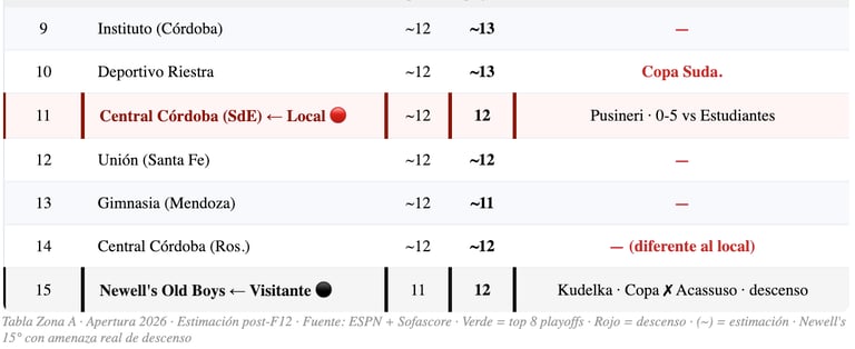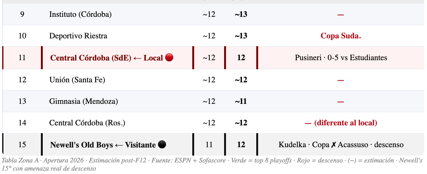 El Estadio Único Madre de Ciudades de Santiago del Estero cierra la actividad del domingo con un duelo de urgencias en la Zona A. Central Córdoba (11°, 12 pts) de Lucas Pusineri recibe a Newell's Old Boys (15°, 12 pts) de Frank Kudelka en lo que ESPN describe como un encuentro donde "la urgencia de sumar" es compartida. Ambos equipos tienen exactamente los mismos puntos — pero la situación de la "lepra" rosarina es más alarmante: cero victorias en sus últimas cinco salidas de visitante y eliminada de la Copa Argentina por un equipo de la tercera división.