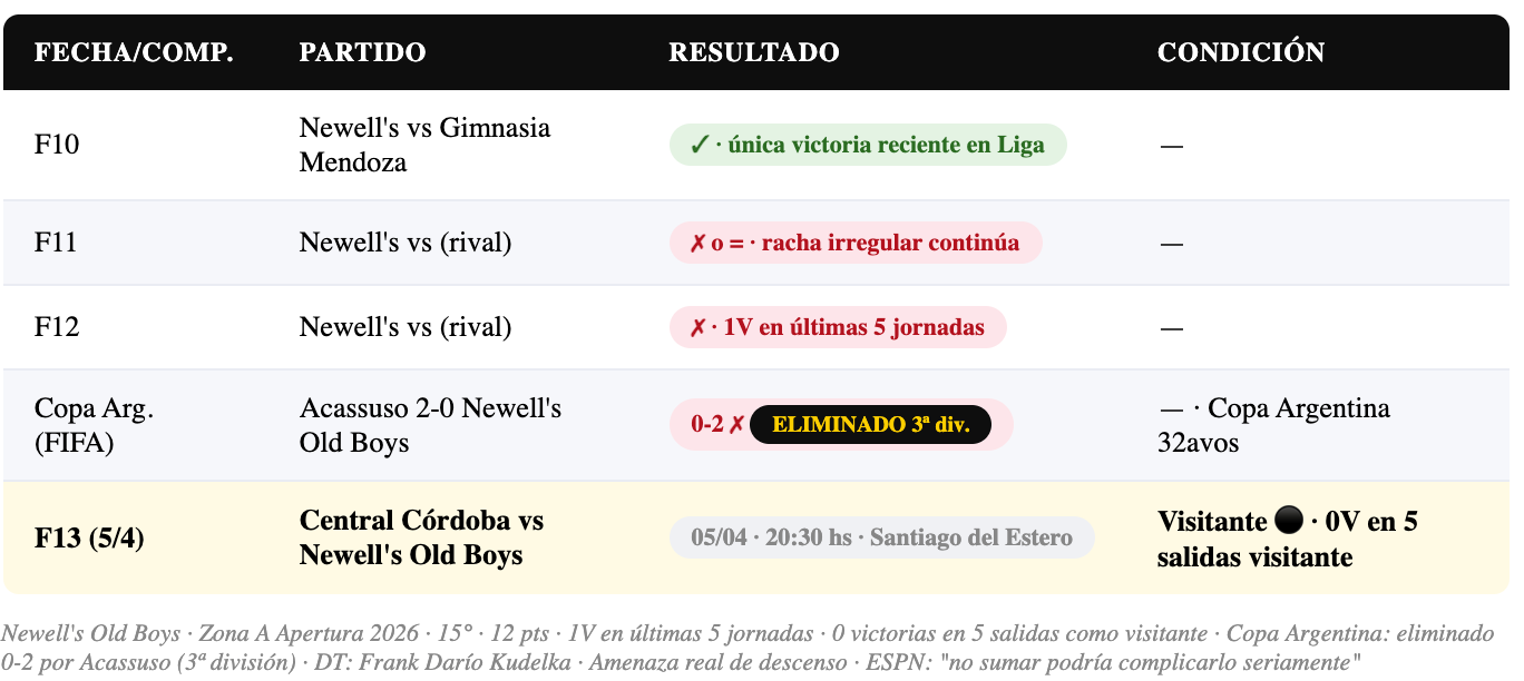 Newell's Old Boys de Frank Kudelka atraviesa uno de sus momentos más difíciles en años. La eliminación 2-0 ante Acassuso en Copa Argentina fue el punto más bajo de la temporada. En Liga, la situación tampoco mejora: una sola victoria en las últimas cinco jornadas y ningún triunfo en sus 5 salidas como visitante en el Apertura 2026. ESPN es directo: "la urgencia de sumar y reencontrarse con un rumbo que aún no logra consolidar." El 15° lugar con 12 puntos y el descenso como amenaza real hacen de este partido una final para el conjunto rosarino.