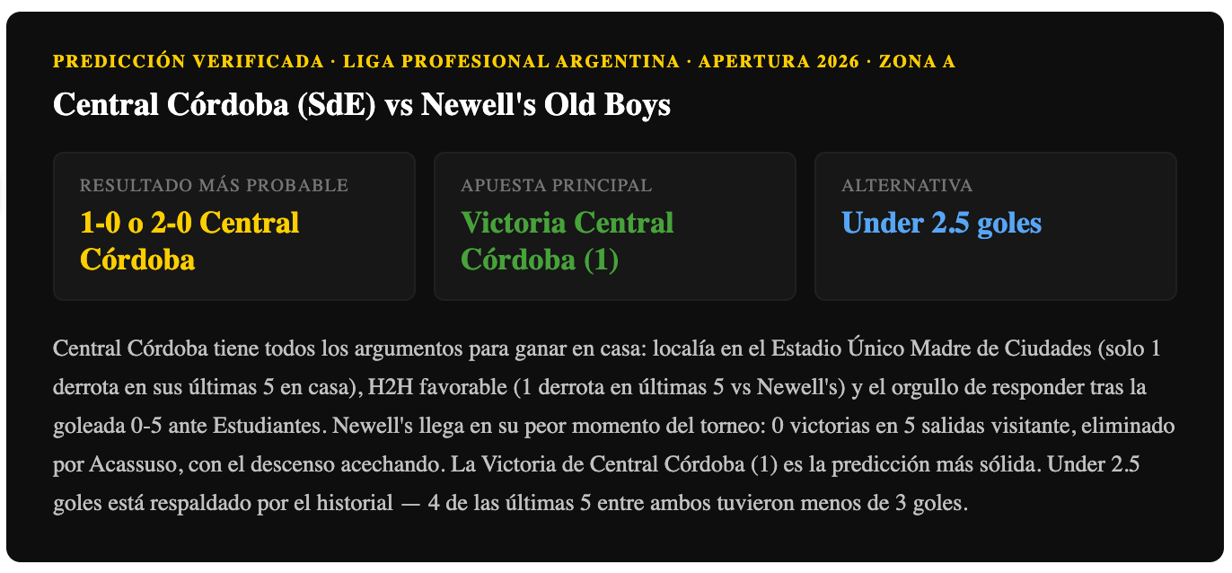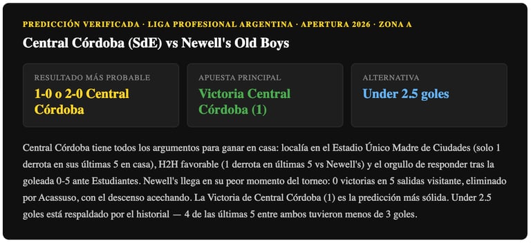 Central Córdoba es el favorito — localía en Santiago del Estero, registro sólido en casa y H2H favorable (1 derrota en 5 vs Newell's). El equipo de Pusineri necesita responder tras el 0-5 ante Estudiantes. Newell's llega en su peor momento: eliminado por Acassuso, 0 victorias de visitante, amenaza de descenso. La victoria de Central Córdoba (1) tiene el mayor respaldo. Under 2.5 goles está bien sustentado por el historial de partidos cerrados entre ambos.